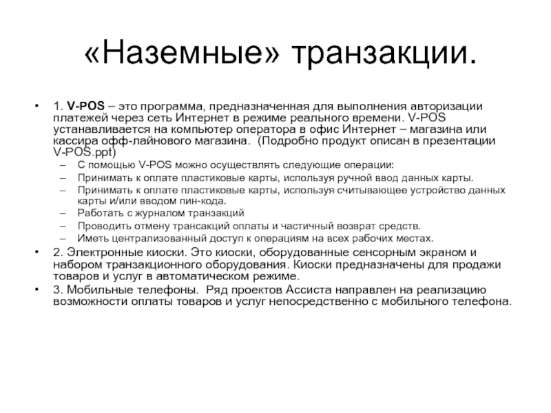 авторизации платежей через сеть Интернет в режиме реального времени. V-POS устанавливается на компьютер оператора в офис Интернет – магазина или кассира офф-лайнового магазина. (Подробно продукт описан в презентации V-POS.ppt)
