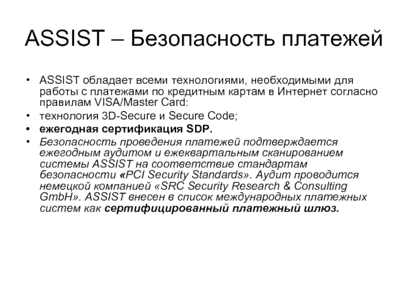 Безопасность проведения платежей подтверждается ежегодным аудитом и ежеквартальным сканированием системы ASSIST на соответствие стандартам безопасности «PCI Security Standards». Аудит проводится немецкой компанией «SRC Security Research & Consulting GmbH». ASSIST внесен в список международных платежных систем как сертифицированный платежный шлюз.