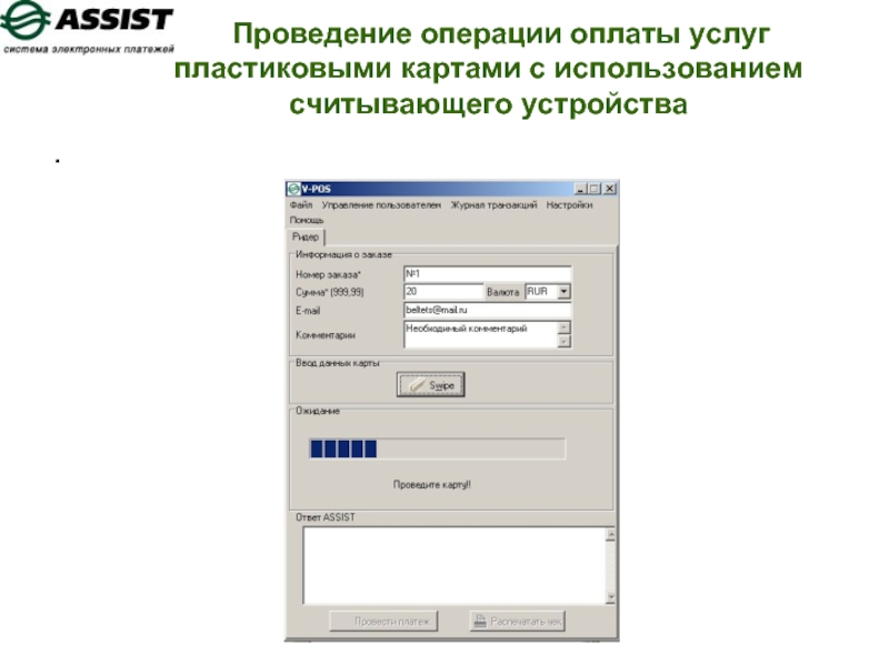 Слайд 19 Проведение операции оплаты услуг пластиковыми картами с использованием считывающего