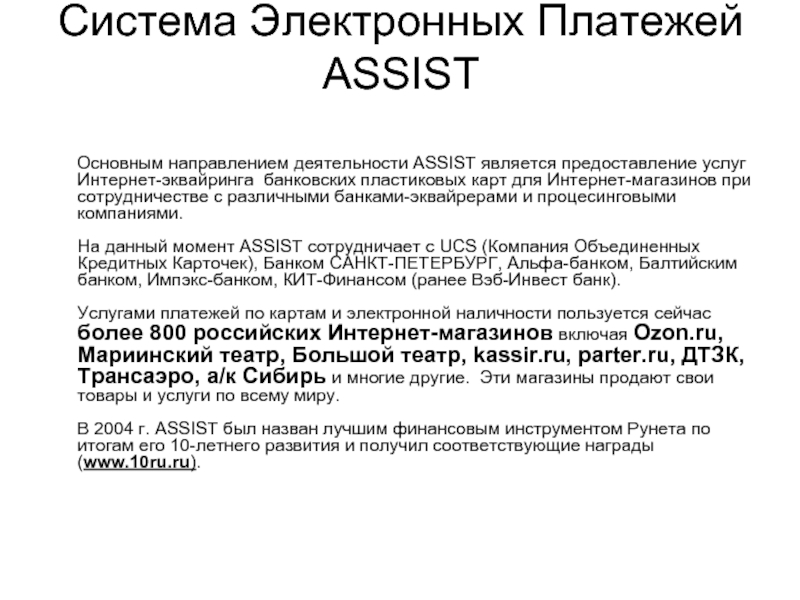В 2004 г. ASSIST был назван лучшим финансовым инструментом Рунета по итогам его 10-летнего развития и получил соответствующие награды (www.10ru.ru).