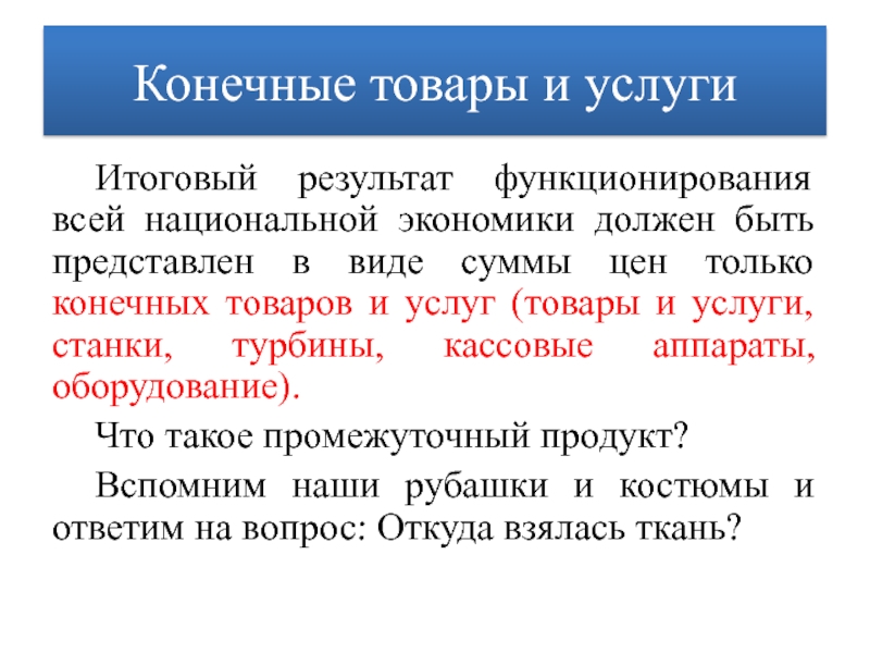 представлен в виде суммы цен только конечных товаров и услуг (товары и услуги, станки, турбины, кассовые аппараты, оборудование).