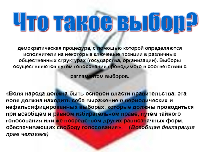 «Воля народа должна быть основой власти правительства; эта воля должна находить себе выражение в периодических и нефальсифицированных выборах, которые должны проводиться при всеобщем и равном избирательном праве, путем тайного голосования или же посредством других равнозначных форм, обеспечивающих свободу голосования». (Всеобщая декларация прав человека)