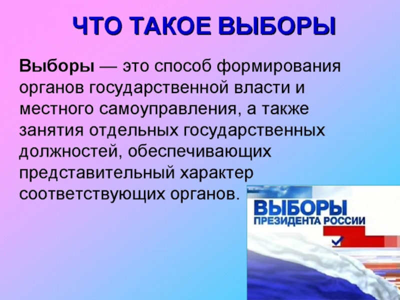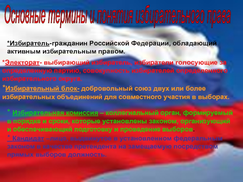 *Электорат- выбирающий избиратель, избиратели голосующие за определенную партию, совокупность избирателей определенного избирательного округа.