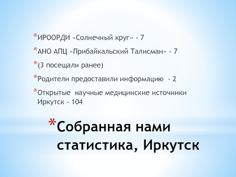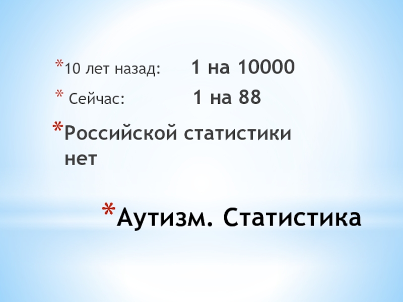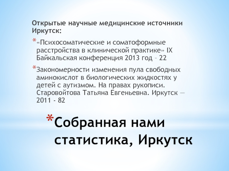 Закономерности изменения пула свободных аминокислот в биологических жидкостях у детей с аутизмом. На правах рукописи. Старовойтова Татьяна Евгеньевна. Иркутск — 2011 - 82
