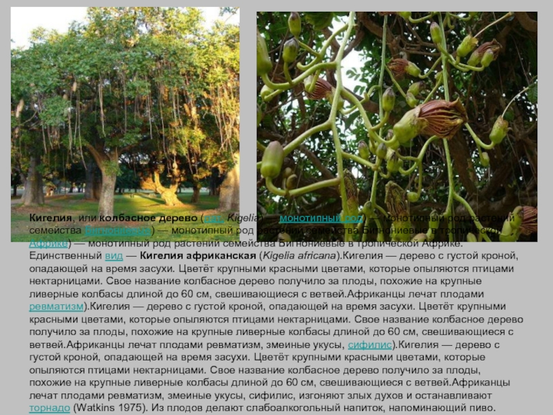 Бигнониевые) — монотипный род растений семейства Бигнониевые в тропической Африке) — монотипный род растений семейства Бигнониевые в тропической Африке. Единственный вид — Кигелия африканская (Kigelia africana).Кигелия — дерево с густой кроной, опадающей на время засухи. Цветёт крупными красными цветами, которые опыляются птицами нектарницами. Свое название колбасное дерево получило за плоды, похожие на крупные ливерные колбасы длиной до 60 см, свешивающиеся с ветвей.Африканцы лечат плодами ревматизм).Кигелия — дерево с густой кроной, опадающей на время засухи. Цветёт крупными красными цветами, которые опыляются птицами нектарницами. Свое название колбасное дерево получило за плоды, похожие на крупные ливерные колбасы длиной до 60 см, свешивающиеся с ветвей.Африканцы лечат плодами ревматизм, змеиные укусы, сифилис).Кигелия — дерево с густой кроной, опадающей на время засухи. Цветёт крупными красными цветами, которые опыляются птицами нектарницами. Свое название колбасное дерево получило за плоды, похожие на крупные ливерные колбасы длиной до 60 см, свешивающиеся с ветвей.Африканцы лечат плодами ревматизм, змеиные укусы, сифилис, изгоняют злых духов и останавливают торнадо (Watkins 1975). Из плодов делают слабоалкогольный напиток, напоминающий пиво. Свежие плоды ядовиты и обладают сильным слабительным эффектом. Для употребления в пищу плоды сушат, жарят или ферментируют.