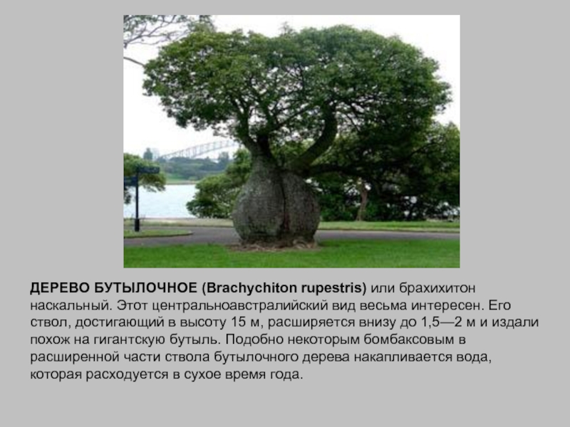 Слайд 14ДЕРЕВО БУТЫЛОЧНОЕ (Brachychiton rupestris) или брахихитон наскальный. Этот центральноавстралийский вид весьма