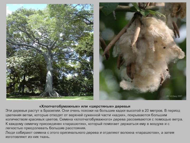 Эти деревья растут в Бразилии. Они очень похожи на большие кадки высотой в 20 метров. В период цветения ветви, которые отходят от верхней суженной части «кадки», покрываются большим количеством красивых цветов. Семена «хлопчатобумажного» дерева рассеиваются с помощью ветра. К каждому семечку присоединен «парашютик», который помогает держаться ему в воздухе и с легкостью преодолевать большие расстояния.