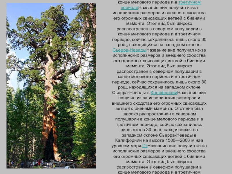 Название вид получил из-за исполинских размеров и внешнего сходства его огромных свисающих ветвей с бивнями мамонта. Этот вид был широко распространен в северном полушарии в конце мелового периодаНазвание вид получил из-за исполинских размеров и внешнего сходства его огромных свисающих ветвей с бивнями мамонта. Этот вид был широко распространен в северном полушарии в конце мелового периода и в третичном периодеНазвание вид получил из-за исполинских размеров и внешнего сходства его огромных свисающих ветвей с бивнями мамонта. Этот вид был широко распространен в северном полушарии в конце мелового периода и в третичном периоде, сейчас сохранилось лишь около 30 рощ, находящихся на западном склоне Сьерра-НевадыНазвание вид получил из-за исполинских размеров и внешнего сходства его огромных свисающих ветвей с бивнями мамонта. Этот вид был широко распространен в северном полушарии в конце мелового периода и в третичном периоде, сейчас сохранилось лишь около 30 рощ, находящихся на западном склоне Сьерра-Невады в КалифорнииНазвание вид получил из-за исполинских размеров и внешнего сходства его огромных свисающих ветвей с бивнями мамонта. Этот вид был широко распространен в северном полушарии в конце мелового периода и в третичном периоде, сейчас сохранилось лишь около 30 рощ, находящихся на западном склоне Сьерра-Невады в Калифорнии на высоте 1500—2000 м над уровнем моря.[1]Название вид получил из-за исполинских размеров и внешнего сходства его огромных свисающих ветвей с бивнями мамонта. Этот вид был широко распространен в северном полушарии в конце мелового периода и в третичном периоде, сейчас сохранилось лишь около 30 рощ, находящихся на западном склоне Сьерра-Невады в Калифорнии на высоте 1500—2000 м над уровнем моря.[1]:376 Именно cеквойядендроны (а не секвойиНазвание вид получил из-за исполинских размеров и внешнего сходства его огромных свисающих ветвей с бивнями мамонта. Этот вид был широко распространен в северном полушарии в конце мелового периода и в третичном периоде, сейчас сохранилось лишь около 30 рощ, находящихся на западном склоне Сьерра-Невады в Калифорнии на высоте 1500—2000 м над уровнем моря.[1]:376 Именно cеквойядендроны (а не секвойи) можно увидеть в Национальном парке Секвойя.