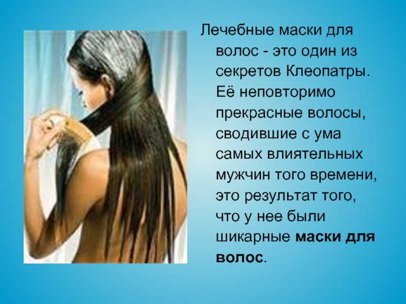 Слайд 13Лечебные маски для волос - это один из секретов Клеопатры. Её