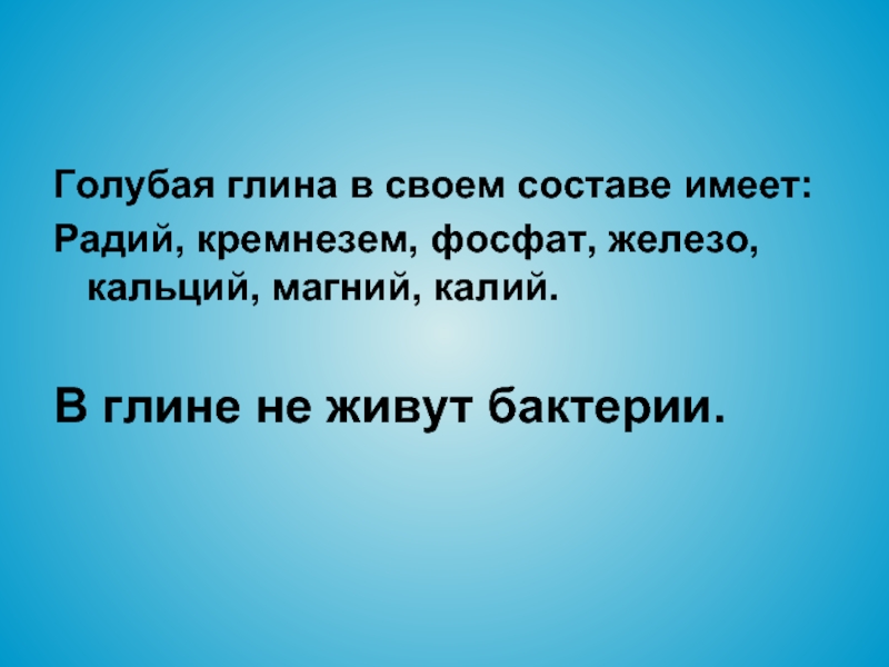 Слайд 11Голубая глина в своем составе имеет: