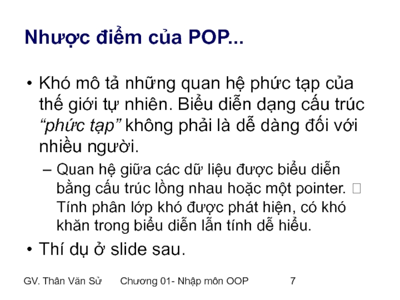 Quan hệ giữa các dữ liệu được biểu diễn bằng cấu trúc lồng nhau hoặc một pointer. ? Tính phân lớp khó được phát hiện, có khó khăn trong biểu diễn lẫn tính dễ hiểu.