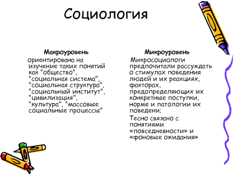 Микросоциологи предпочитали рассуждать о стимулах поведения людей и их реакциях, факторах, предопределяющих их конкретные поступки, норме и патологии их поведени;