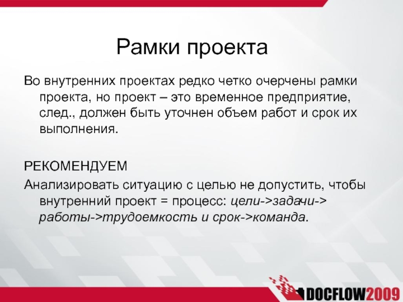 Во внутренних проектах редко четко очерчены рамки проекта, но проект