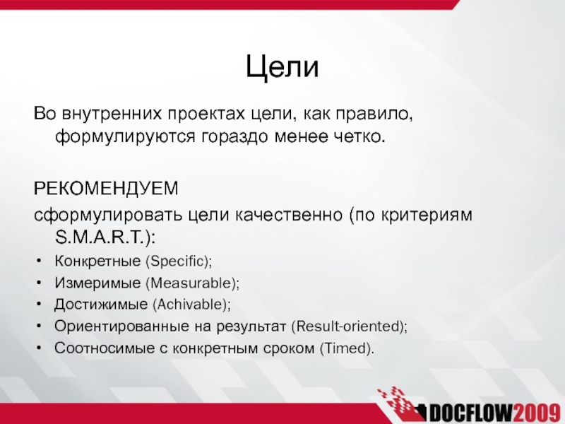 Формулируйте цели так, чтобы методика оценки их достижения была однозначной.