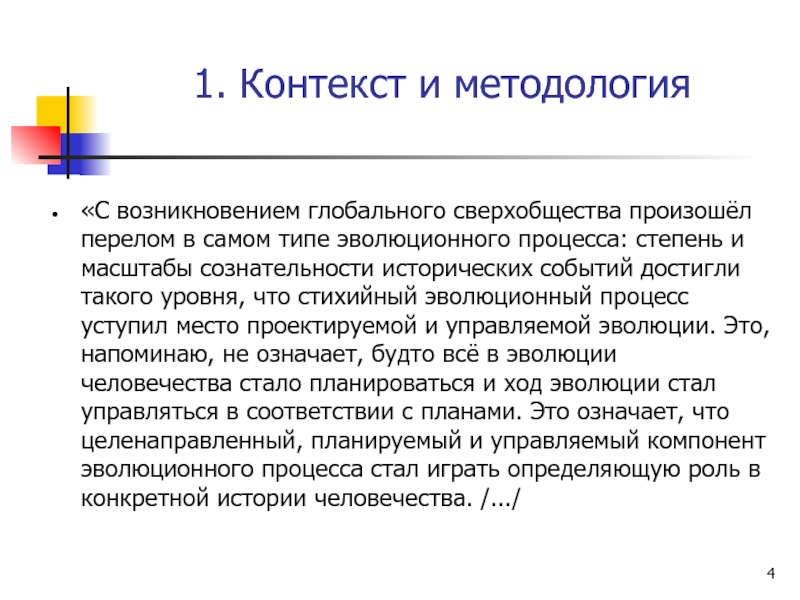типе эволюционного процесса: степень и масштабы сознательности исторических событий достигли такого уровня, что стихийный эволюционный процесс уступил место проектируемой и управляемой эволюции. Это, напоминаю, не означает, будто всё в эволюции человечества стало планироваться и ход эволюции стал управляться в соответствии с планами. Это означает, что целенаправленный, планируемый и управляемый компонент эволюционного процесса стал играть определяющую роль в конкретной истории человечества. /.../