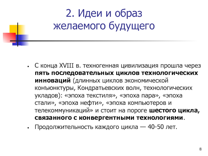 через пять последовательных циклов технологических инноваций (длинных циклов экономической конъюнктуры, Кондратьевских волн, технологических укладов): «эпоха текстиля», «эпоха пара», «эпоха стали», «эпоха нефти», «эпоха компьютеров и телекоммуникаций» и стоит на пороге шестого цикла, связанного с конвергентными технологиями.
