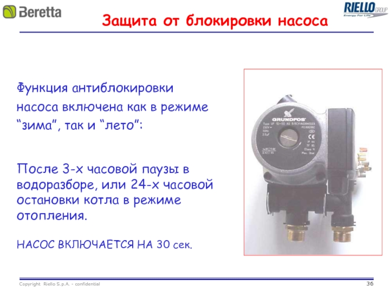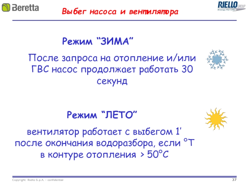 вентилятор работает с выбегом 1’ после окончания водоразбора, если °T в контуре отопления > 50°C