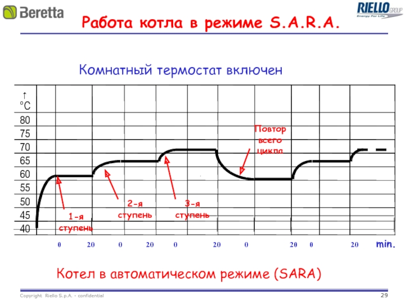 Если система требует меньшую тепловую мощность, котел переходит в режим модуляции до истечения 15’.