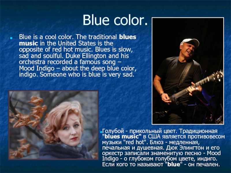 Голубой - прикольный цвет. Традиционная "blues music" в США является противовесом музыки "red hot". Блюз - медленная, печальная и душевная. Дюк Элингтон и его оркестр записали знаменитую песню - Mood Indigo - о глубоком голубом цвете, индиго. Если кого то называют "blue" - он печален.
