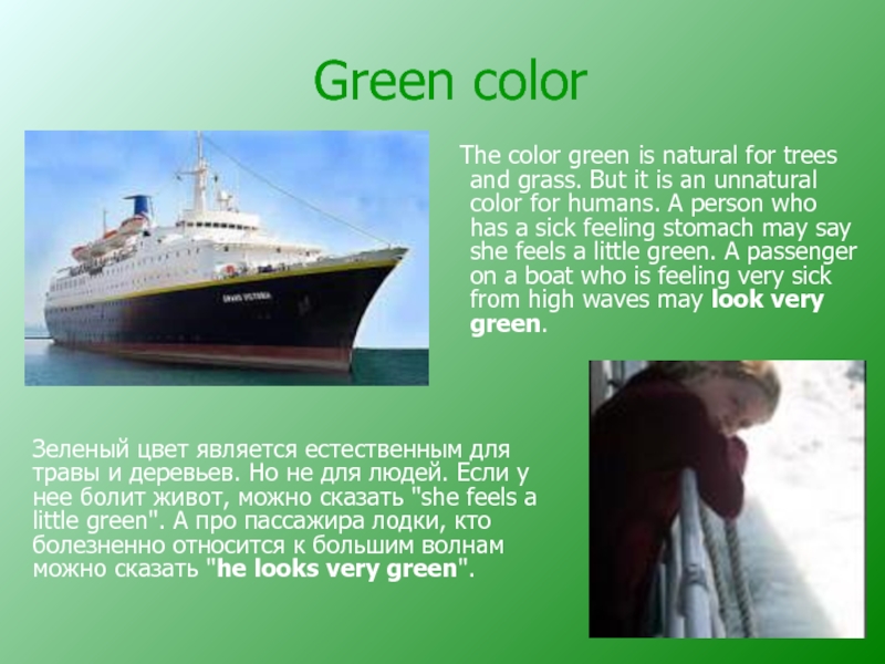 Зеленый цвет является естественным для травы и деревьев. Но не для людей. Если у нее болит живот, можно сказать "she feels a little green". А про пассажира лодки, кто болезненно относится к большим волнам можно сказать "he looks very green".