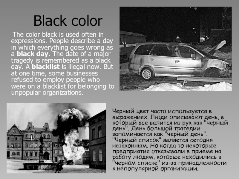 Черный цвет часто используется в выражениях. Люди описывают день, в который все валится из рук как "черный день". День большой трагедии запоминается как "черный день". "Черный список" является сегодня незаконным. Но когда то некоторые предприятия отказывали в приеме на работу людям, которые находились в "черном списке" из-за принадлежности к непопулярной организации.