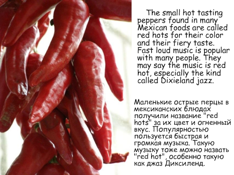 Маленькие острые перцы в мексиканских блюдах получили название "red hots" за их цвет и огненный вкус. Популярностью пользуется быстрая и громкая музыка. Такую музыку тоже можно назвать "red hot", особенно такую как джаз Диксиленд.