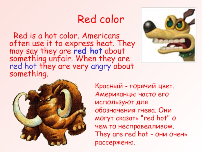 Красный - горячий цвет. Американцы часто его используют для обозначения гнева. Они могут сказать "red hot" о чем то несправедливом. They are red hot - они очень рассержены.