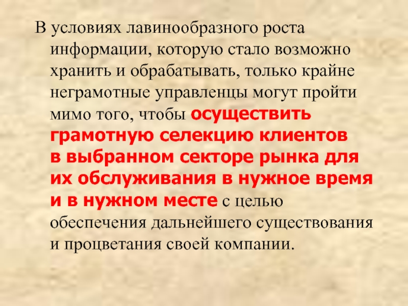 В условиях лавинообразного роста информации, которую стало возможно хранить и обрабатывать, только