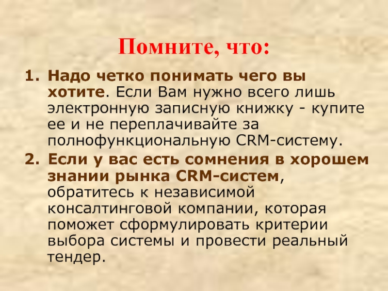 Если у вас есть сомнения в хорошем знании рынка CRM-систем, обратитесь к независимой консалтинговой компании, которая поможет сформулировать критерии выбора системы и провести реальный тендер.