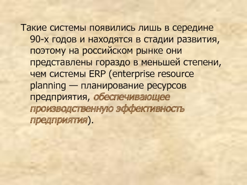 развития, поэтому на российском рынке они представлены гораздо в меньшей степени, чем системы ERP (enterprise resource planning — планирование ресурсов предприятия, обеспечивающее производственную эффективность предприятия).