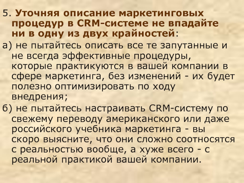 5. Уточняя описание маркетинговых процедур в CRM-системе не впадайте ни в