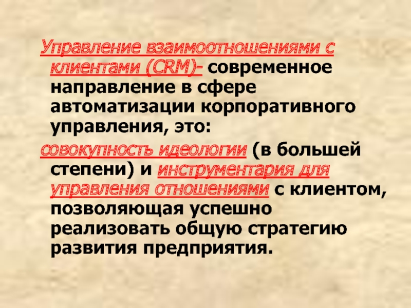 совокупность идеологии (в большей степени) и инструментария для управления отношениями с клиентом, позволяющая успешно реализовать общую стратегию развития предприятия.