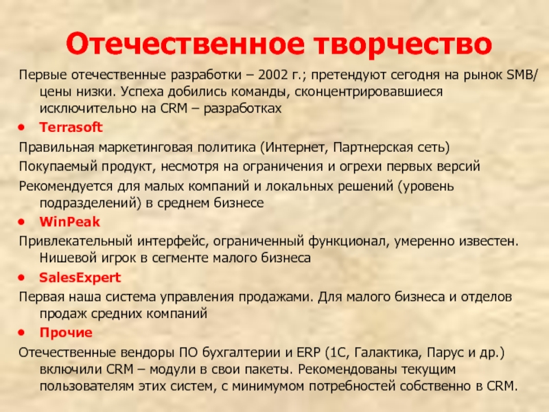 Отечественные вендоры ПО бухгалтерии и ERP (1С, Галактика, Парус и др.) включили CRM – модули в свои пакеты. Рекомендованы текущим пользователям этих систем, с минимумом потребностей собственно в CRM.