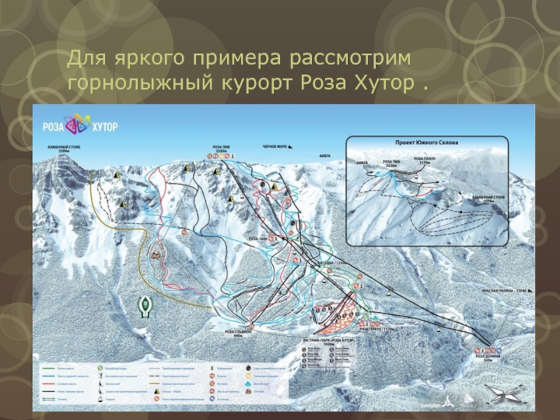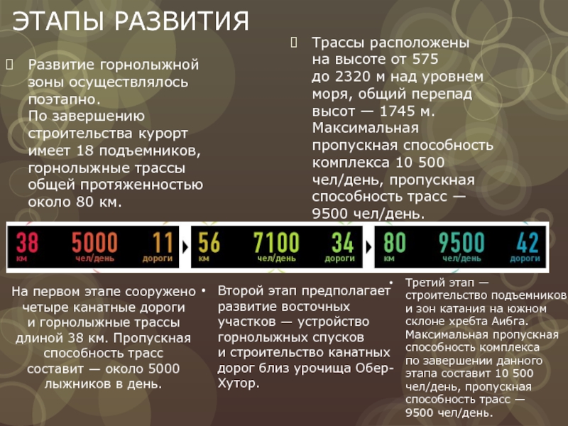 На первом этапе сооружено четыре канатные дороги и горнолыжные трассы длиной 38 км. Пропускная способность трасс составит — около 5000 лыжников в день.