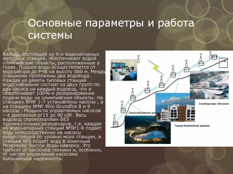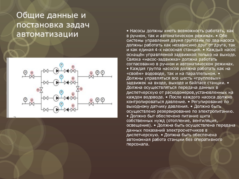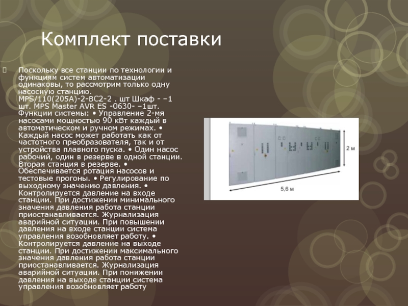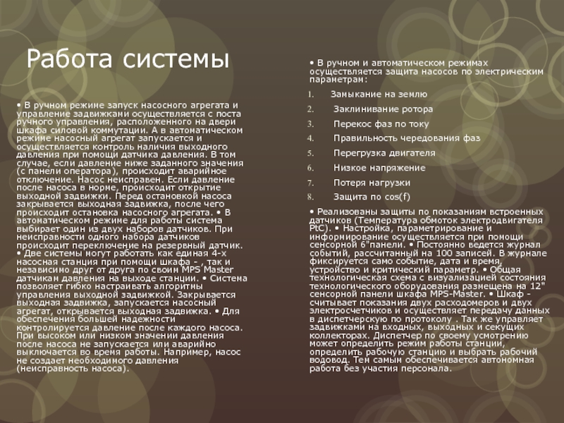 • Реализованы защиты по показаниям встроенных датчиков (Температура обмоток электродвигателя PtС). • Настройка, параметрирование и информирование осуществляется при помощи сенсорной 6"панели. • Постоянно ведется журнал событий, рассчитанный на 100 записей. В журнале фиксируется само событие, дата и время, устройство и критический параметр. • Общая технологическая схема с визуализацией состояния технологического оборудования размещена на 12" сенсорной панели шкафа MPS-Master. • Шкаф - считывает показания двух расходомеров и двух электросчетчиков и осуществляет передачу данных в диспетчерскую по протоколу . Так же управляет задвижками на входных, выходных и секущих коллекторах. Диспетчер по своему усмотрению может определить режим работы станции, определить рабочую станцию и выбрать рабочий водовод. Тем самым обеспечивается автономная работа без участия персонала.