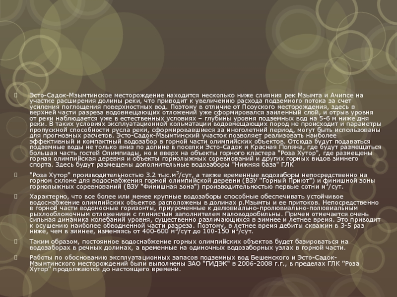Водоснабжение Горных олимпийских объектов предполагается обеспечить, в основном, за счет Бешенского (11 тыс.м3/сут) и Эсто-Садок-Мзымтинского месторождений подземных вод (14 тыс.м3/сут), позволяющих подавать воду в пос.Красная Поляна и Эсто-Садок с двух разных сторон.