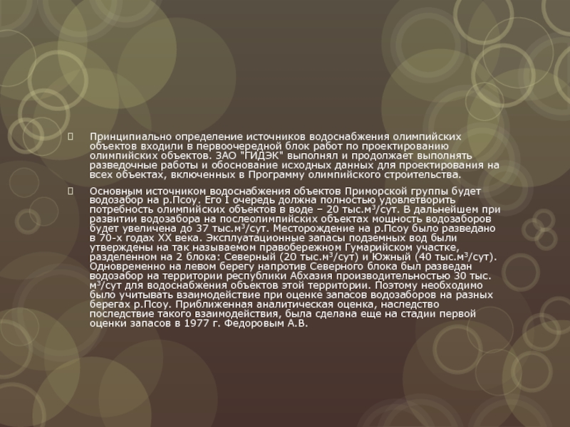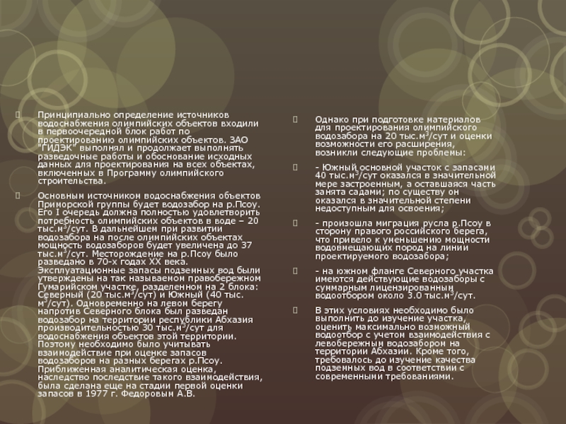 Однако при подготовке материалов для проектирования олимпийского водозабора на 20 тыс.м3/сут и оценки возможности его расширения, возникли следующие проблемы: