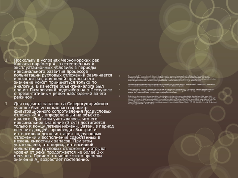 Более полный учет всех особенностей формирования запасов на разработанной математической модели Северогумарийского участка с использованием аналогии позволил более обоснованно принять параметры взаимосвязи подземных и поверхностных вод, оценить условия взаимодействия левобережного и правобережного водозабора и обосновать возможность увеличения запасов этого участка с 20 до 40 тыс.м3/сут.