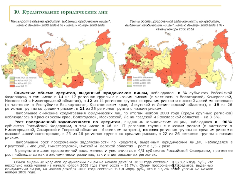 Объем выданных кредитов юридическим лицам на начало декабря 2008 года составил 8 820,2 млрд. руб., что несколько ниже уровня на начало ноября 2008 года (темп роста – 99,7%). Объем просроченных кредитов, выданных юридическим лицам, на начало декабря 2008 года составил 191,8 млрд. руб., что в 17,2% выше уровня на начало ноября 2008 года.