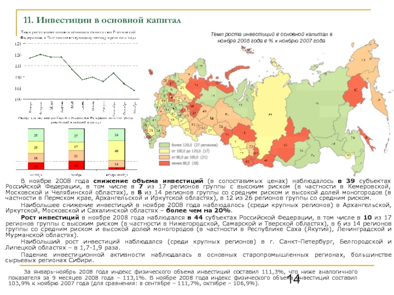 За январь-ноябрь 2008 года индекс физического объема инвестиций составил 111,3%, что ниже аналогичного показателя за 9 месяцев 2008 года – 113,1%. В ноябре 2008 года индекс физического объема инвестиций составил 103,9% к ноябрю 2007 года (для сравнения: в сентябре – 111,7%, октябре – 106,9%).