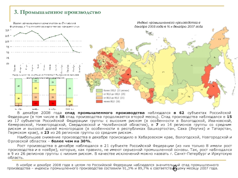 В ноябре и декабре 2008 года в целом по Российской Федерации наблюдался значительный спад промышленного производства – индексы промышленного производства составили 91,3% и 89,7% к соответствующему месяцу 2007 года.