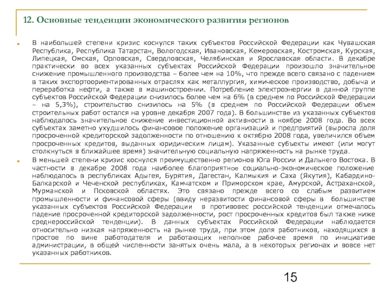 Наиболее неблагоприятная ситуация сложилась в Республиках Бурятия, Саха, Татарстан и Хакасия, Брянской, Вологодской, Кировской, Оренбургской, Ульяновской, Челябинской, Свердловской, Тюменской областях, г. Санкт-Петербург, Ханты-Мансийском автономном округе. В указанных регионах поступления налога на прибыль упали более, чем в 3 раза.