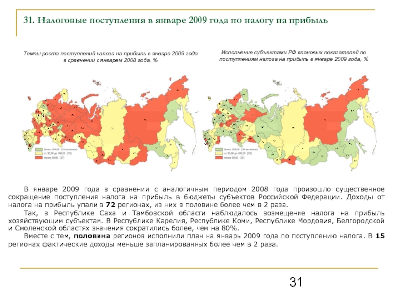 В январе 2009 года в сравнении с аналогичным периодом 2008 года произошло существенное сокращение поступления налога на прибыль в бюджеты субъектов Российской Федерации. Доходы от налога на прибыль упали в 72 регионах, из них в половине более чем в 2 раза.