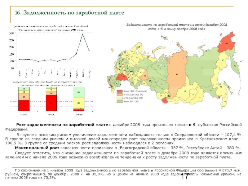 В ноябре 2008 года в 43 субъектах Российской Федерации зафиксировано снижение заработной платы. Снижение наблюдалось в 12 из 17 субъектов Российской Федерации группы с высоким риском (в частности в Белгородской, Челябинской областях, Чувашской Республике), в 7 из 14 регионов группы со средним риском и высокой долей моногородов (в частности Республики Татарстан и Башкортостан, Пермский край), в 17 из 26 регионов группы со средним риском.