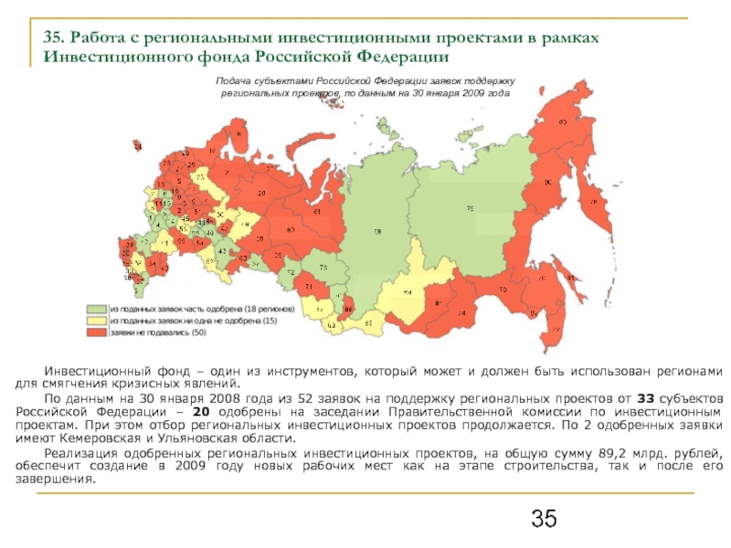 По данным на 30 января 2008 года из 52 заявок на поддержку региональных проектов от 33 субъектов Российской Федерации – 20 одобрены на заседании Правительственной комиссии по инвестиционным проектам. При этом отбор региональных инвестиционных проектов продолжается. По 2 одобренных заявки имеют Кемеровская и Ульяновская области.