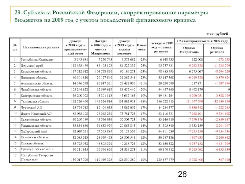 Сравнение показателей исполнения региональных бюджетов в ноябре-декабре 2008 года с аналогичным периодом 2007 года показывает, что в половине регионов произошло снижение доходов, при этом в 13 регионах это снижение составило более 20 процентов, из них 7 регионов формируют собственные бюджеты в основном за счет собственных доходных источников, в связи с чем максимальному риску подвержены именно такие регионы. Это Республика Татарстан, Тюменская, Оренбургская, Челябинская, Вологодская области, г. Санкт-Петербург и Ханты-Мансийский автономный округ.