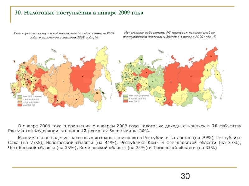 В январе 2009 года в сравнении с январем 2008 года налоговые доходы снизились в 76 субъектах Российской Федерации, из них в 12 регионах более чем на 30%.