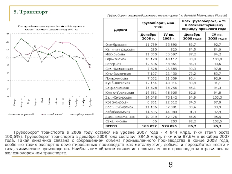 Со снижением производства, особенно в таких энергоемких отраслях как металлургия, химия, производство нефтепродуктов, машиностроение, произошло снижение потребления электроэнергии – в ноябре и декабре 2008 года было потреблено на 6,2 и 5,3% меньше, чем в соответствующих месяцах 2007 года. Несколько меньшее снижение потребления электроэнергии в декабре может говорить о некоторой стабилизации ситуации.