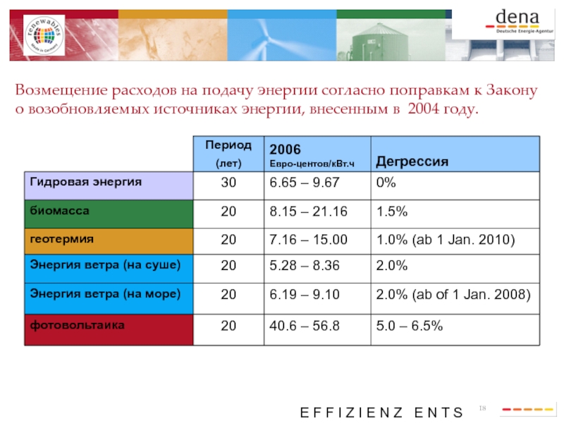 Возмещение расходов на подачу энергии согласно поправкам к Закону о возобновляемых источниках энергии, внесенным в 2004 году.