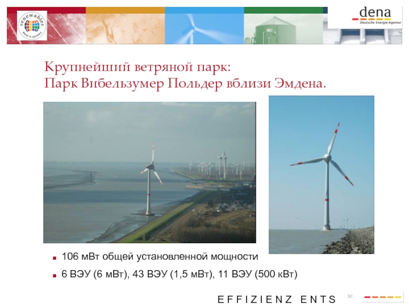 6 ВЭУ (6 мВт), 43 ВЭУ (1,5 мВт), 11 ВЭУ (500 кВт)